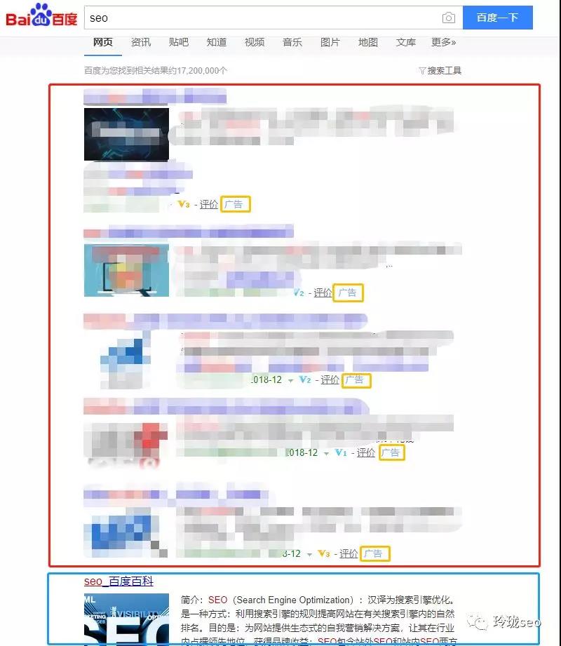 為了避免打廣告嫌疑,敏感信息打了馬賽克??梢钥吹郊t框中都是sem的展示結果,每一條記錄分別都被打上了“廣告”的字樣,也就是說他們都是參與搜索引擎官方付費推廣的,你點擊一次他們的網站,他們就要花掉一筆推廣費用。這也是人民幣玩家的游戲。而籃框中的seo百度百科結果便是seo優(yōu)化做上來的第一名。舉個這樣的例子大家能更好的理解seo和sem的區(qū)別了嗎?