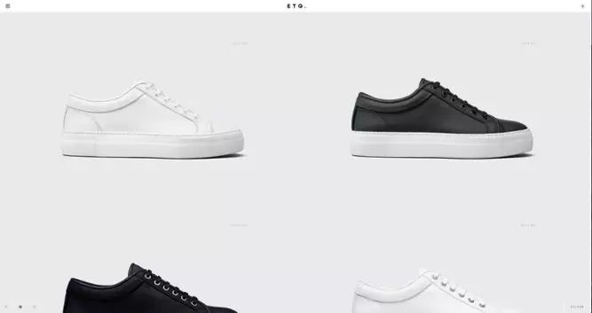 ETQ采用非常簡約的電子商務方式,在精簡的網站上放置大量引人注目的產品視頻。簡單,平坦,基于顏色的背景伴隨著強大的印刷術,有助于將注意力集中在用戶到達的地方:鞋子。