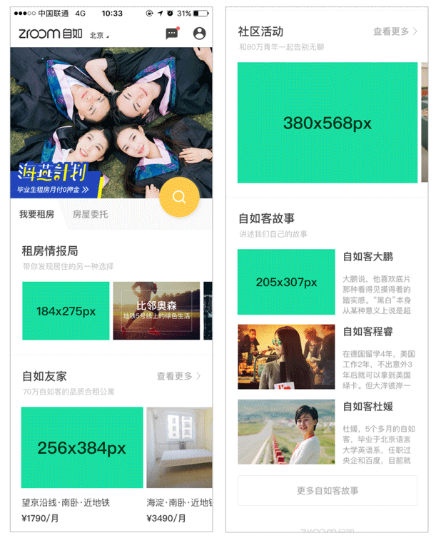 例如自如APP中的圖片,除了BANNER以外的其他圖片,雖然都有大有小尺寸都不同,但是所有的圖片的比例都是一樣的,長寬比例一樣讓我們可以猜想設(shè)計(jì)師是不是因?yàn)闉榱斯?jié)約未來的維護(hù)成本,減少做圖及上傳圖片的次數(shù)而這么設(shè)計(jì)的。
