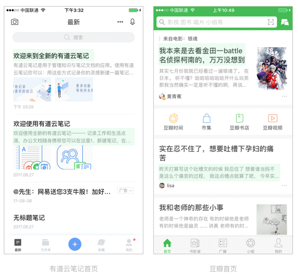 線上很多的APP設(shè)計(jì)標(biāo)準(zhǔn)大多的字體大小是雙數(shù),而不同大小的字體相差幾乎都是4的倍數(shù),比如下面的有道云筆記的標(biāo)題為34px而內(nèi)容的標(biāo)題是26px。還有豆瓣的標(biāo)題為38px而內(nèi)容的字體大小是26px。除了這些以外,越小的字越不重要,比如時(shí)間,比如來源與閱讀量等等。